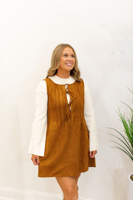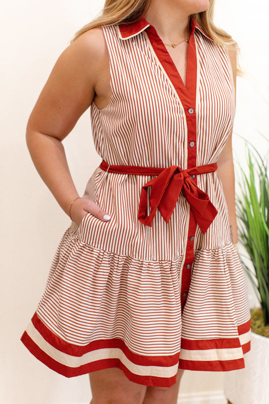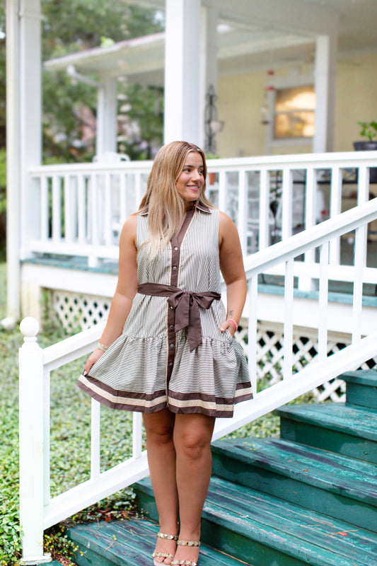 Mocha And Cream Striped Collard V-Neck Button Down Dress With Tie Belt