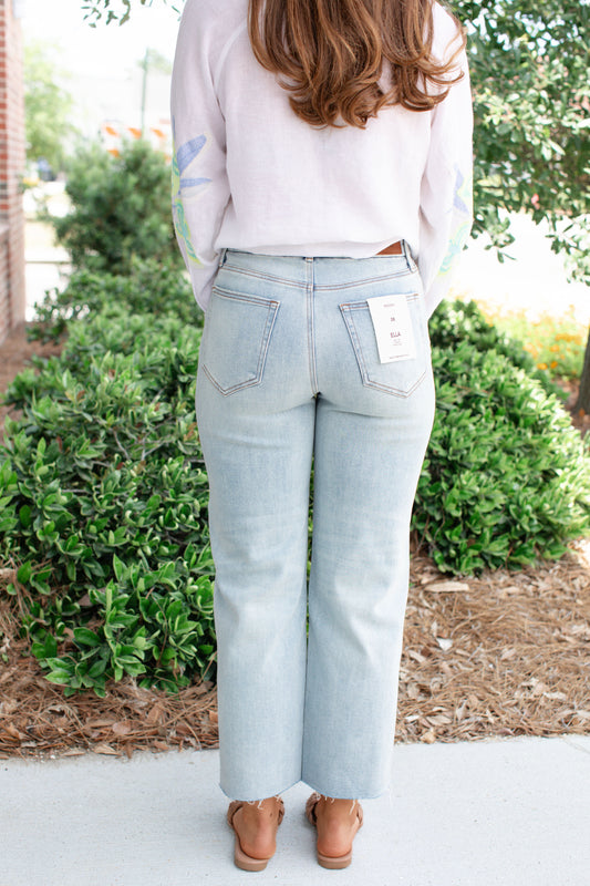 Light Wash Double Waist Band Stretch Wide Straight Jeans