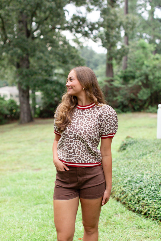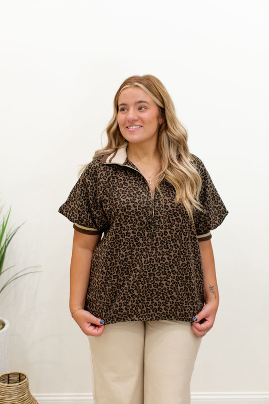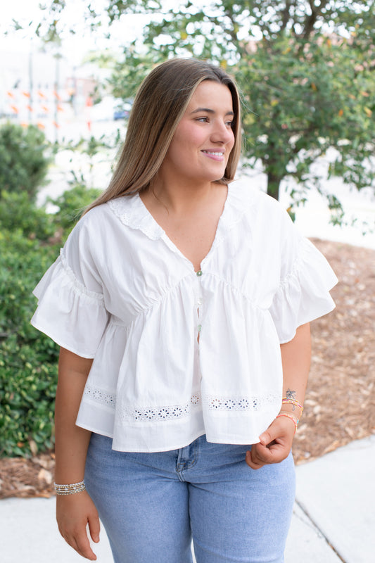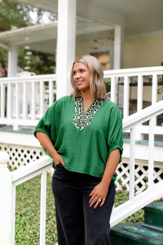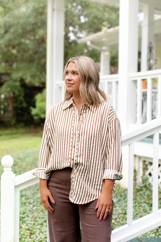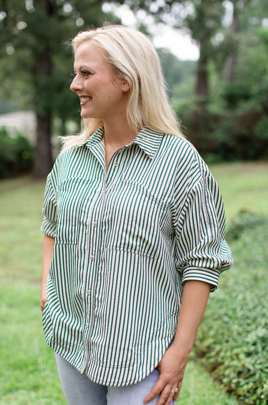 Green and Cream Striped Button Down Top With Deep Front Pockets