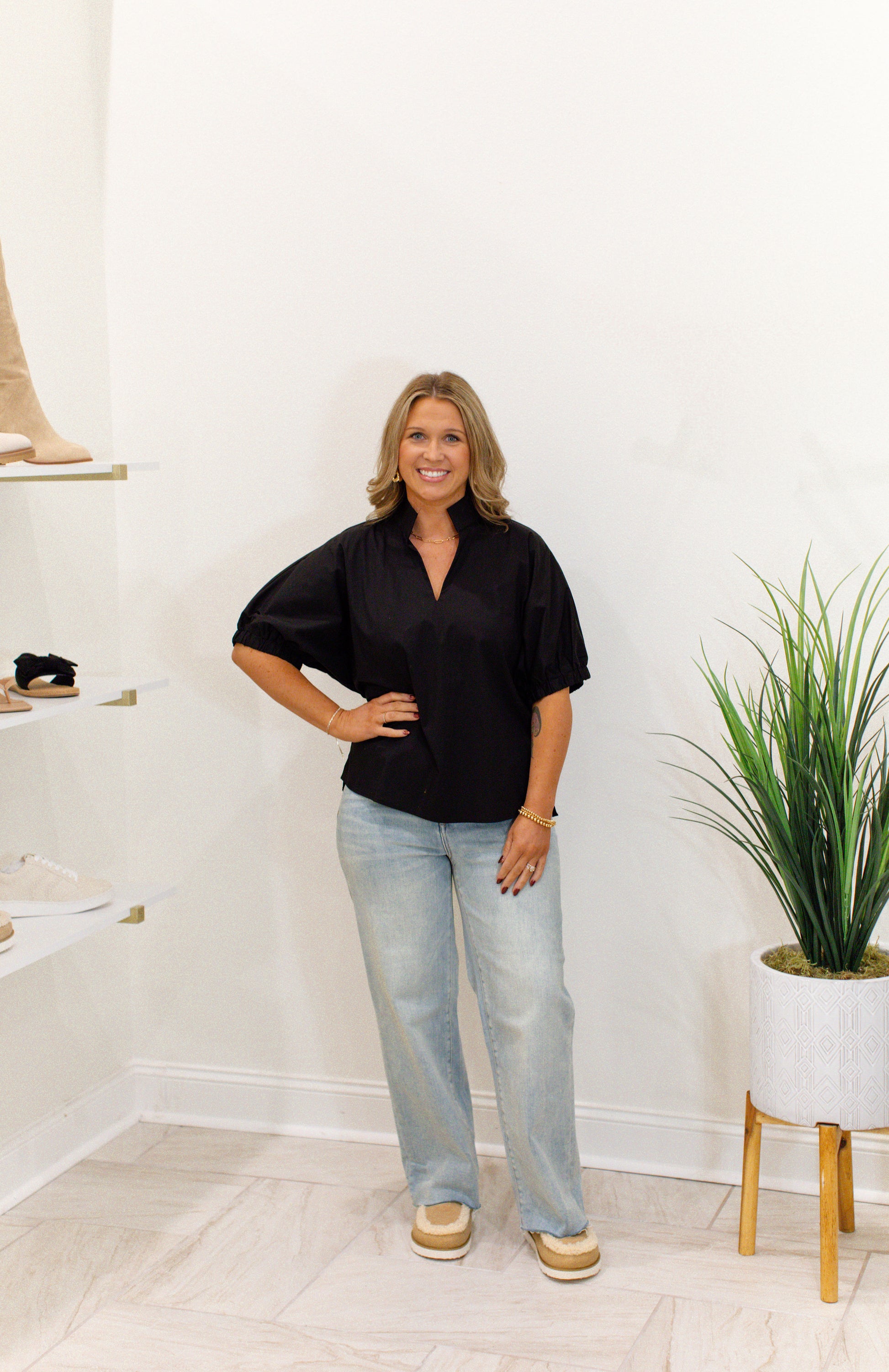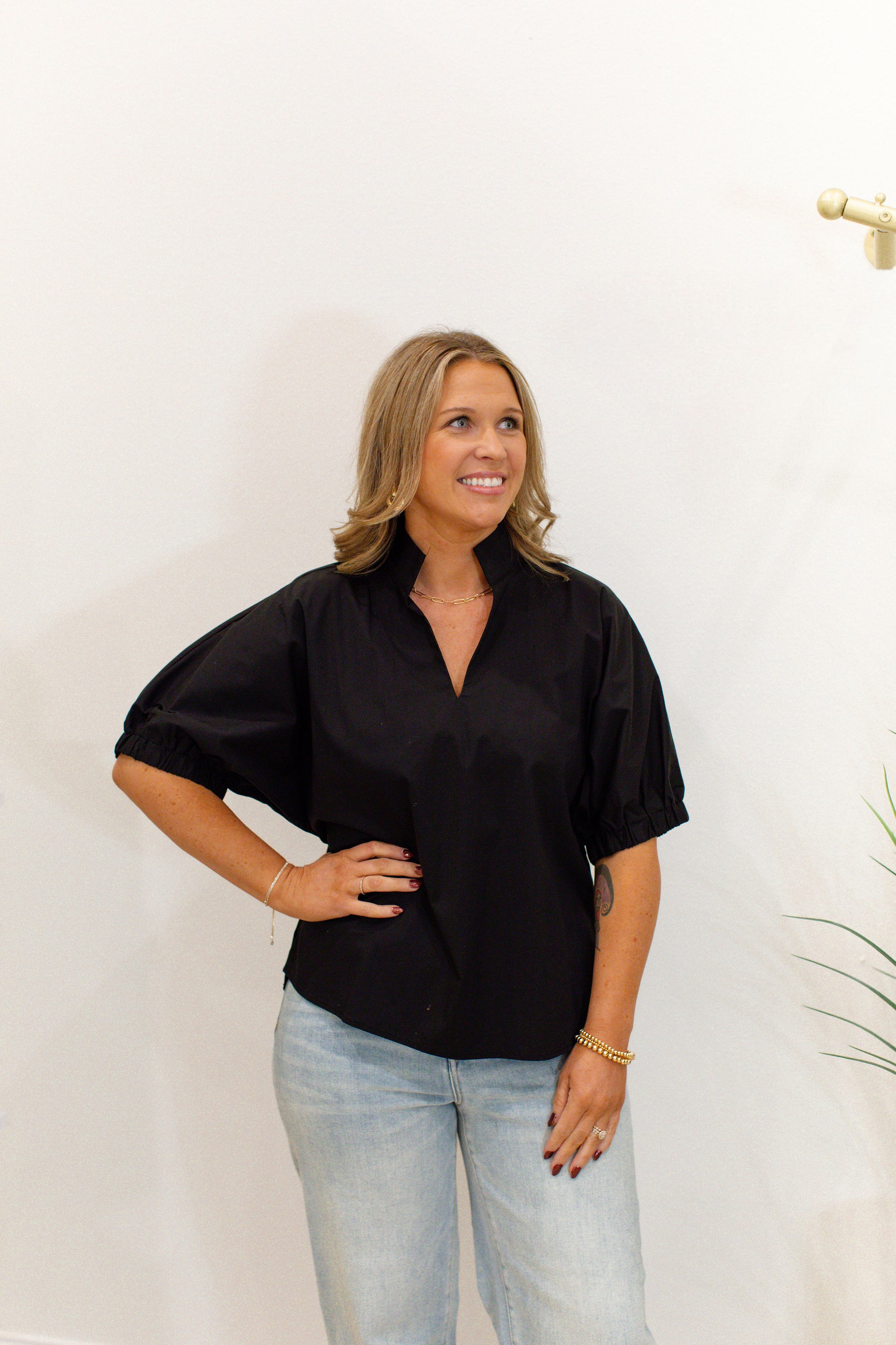 Elevate your style with this Black Puff Sleeve Top featuring a flattering V-neck and a sophisticated standing collar. Crafted from a lightweight woven blend of 70% cotton, 27% nylon, and 3% spandex, it offers comfortable stretch and breathability without being sheer. The unlined design ensures an effortless, airy feel, while the puff sleeves add a touch of feminine drama perfect for both casual and dressed-up occasions. This versatile piece is a stylish addition to any wardrobe, combining comfort and elegance with ease.