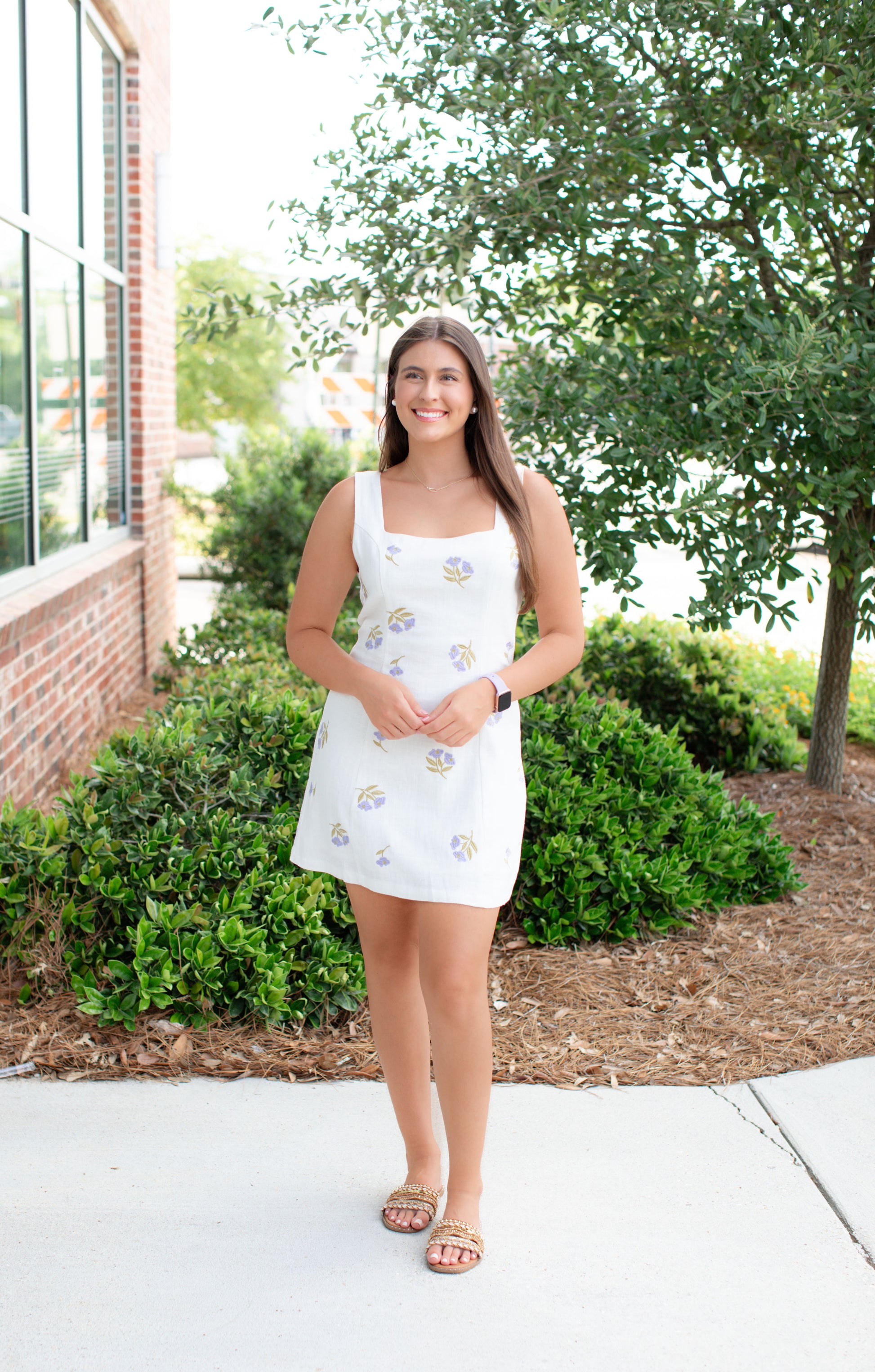 Discover the perfect balance between elegance and comfort with our Embroidered Square Neck Mini Dress. Crafted with 100% Ramie, this off white dress features delicate embroidered flowers, adding a touch of charm to your wardrobe. Elevate your style with this must-have piece.