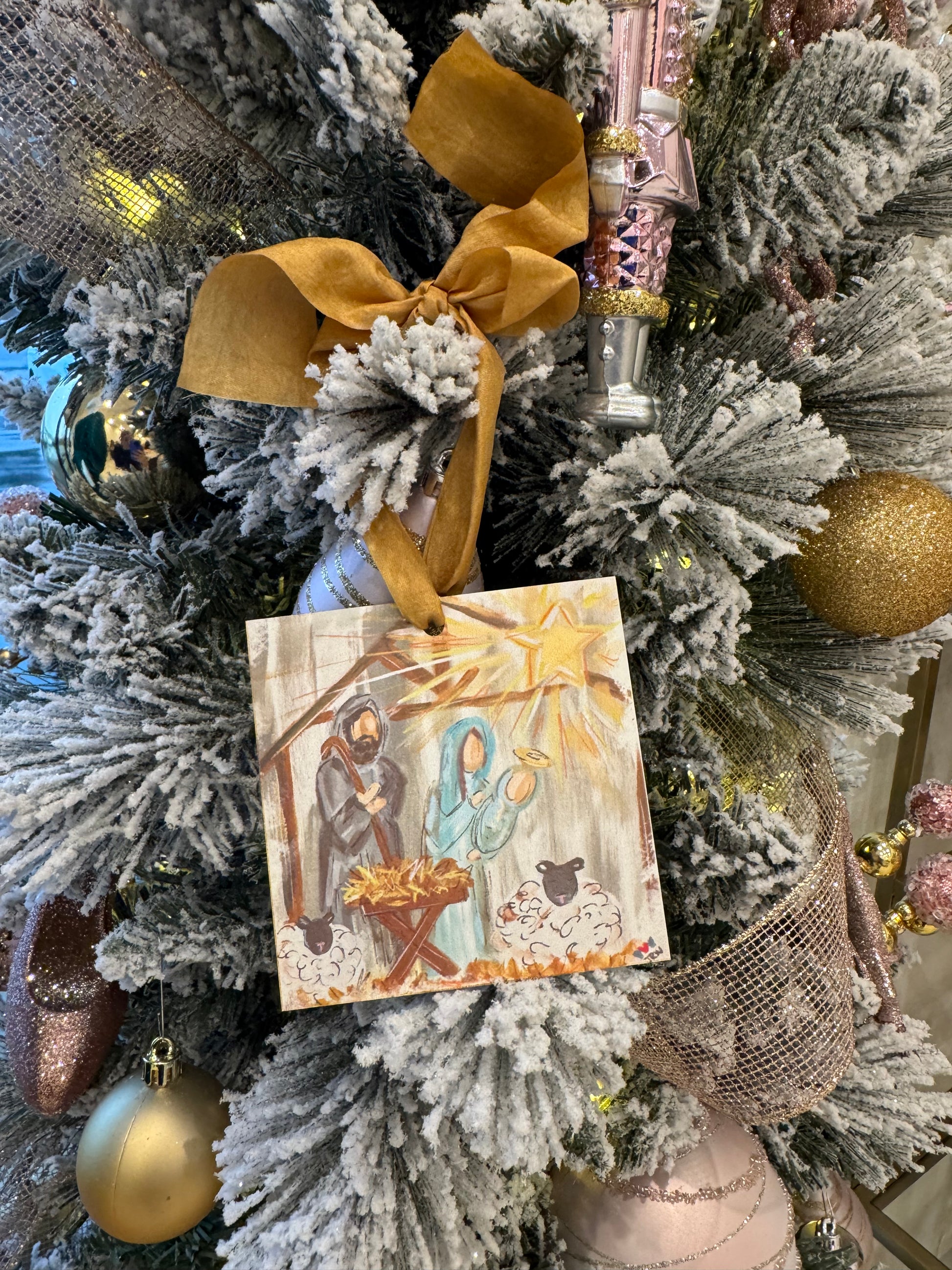This watercolor art nativity is brightly colored on a square 4x4 ornament with a silk ribbon hanger