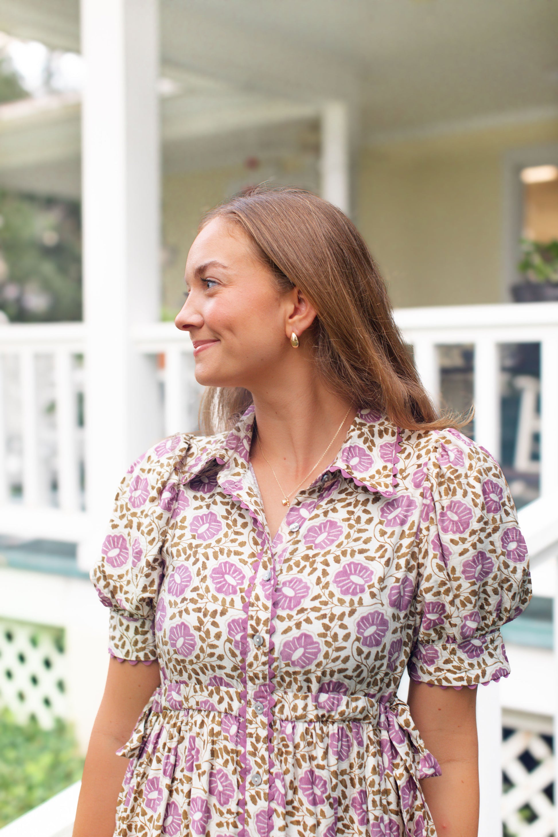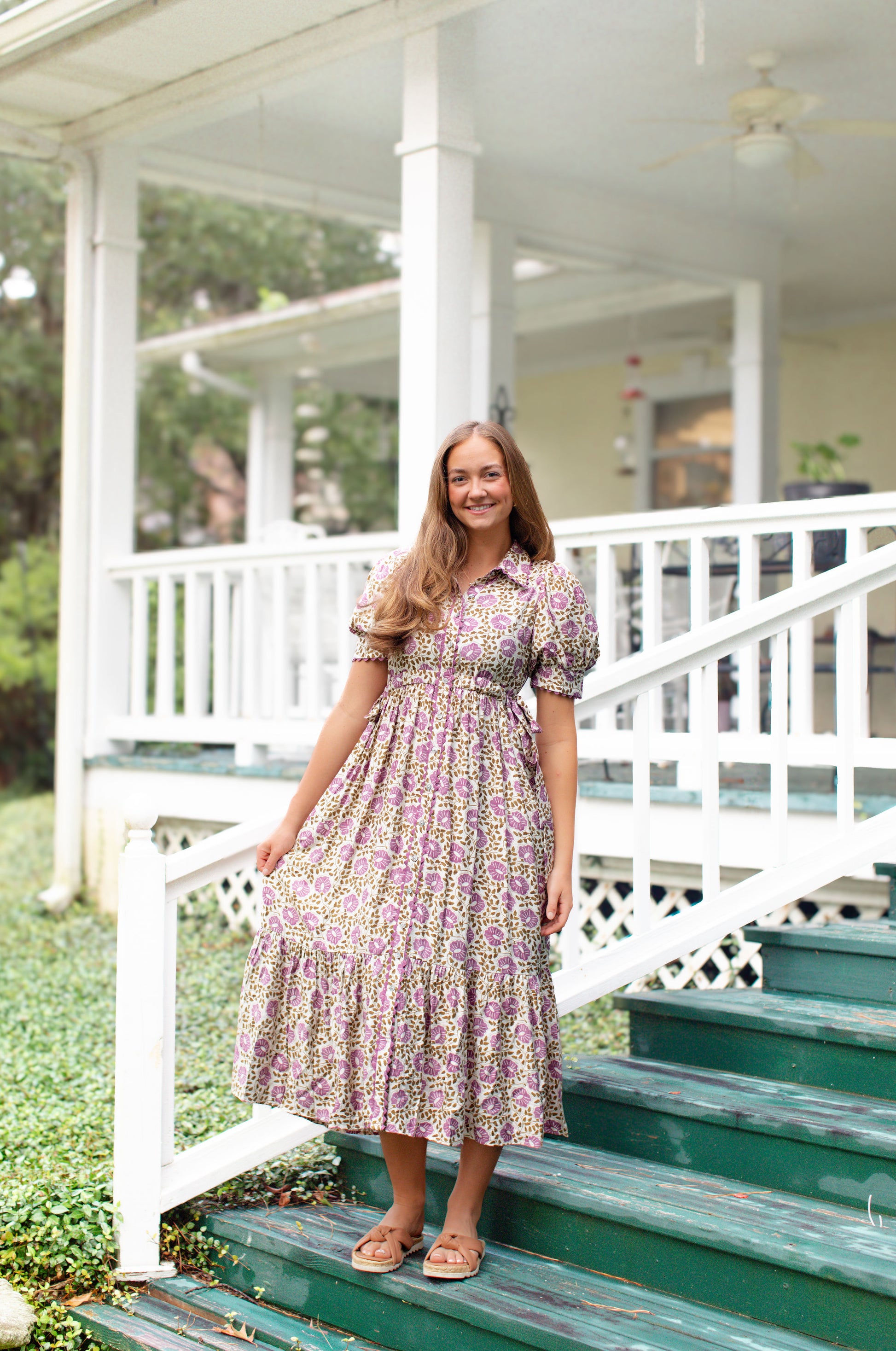 This purple floral maxi dress features a soft blend of 80% rayon and 20% nylon with a 100% rayon lining for comfortable wear. Designed with a classic collar and button-down front, it offers adjustable side ties to cinch the waist for a flattering silhouette. The ruffled bottom adds a feminine, flowing finish, making it an ideal choice for both daytime events and evening outings. Elevate your wardrobe with this stylish and versatile dress.