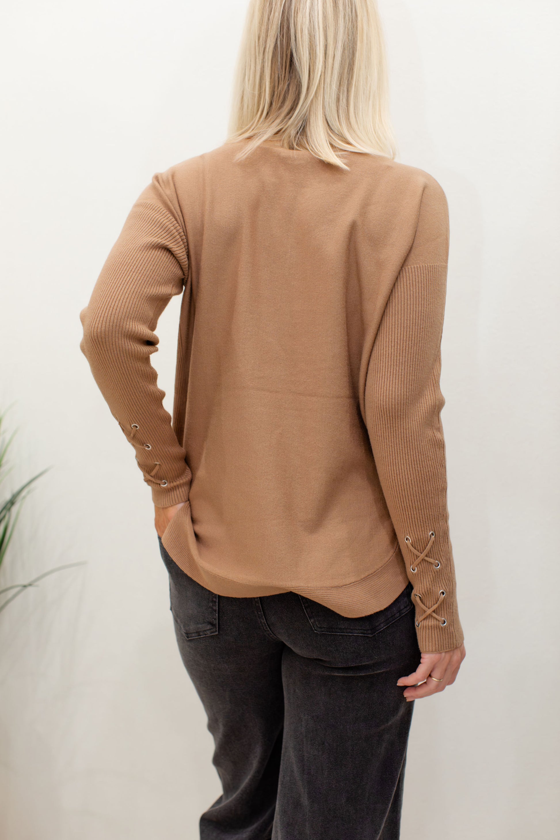 Round Hem Sweater With Front Pockets And Sleeve lacing Detail