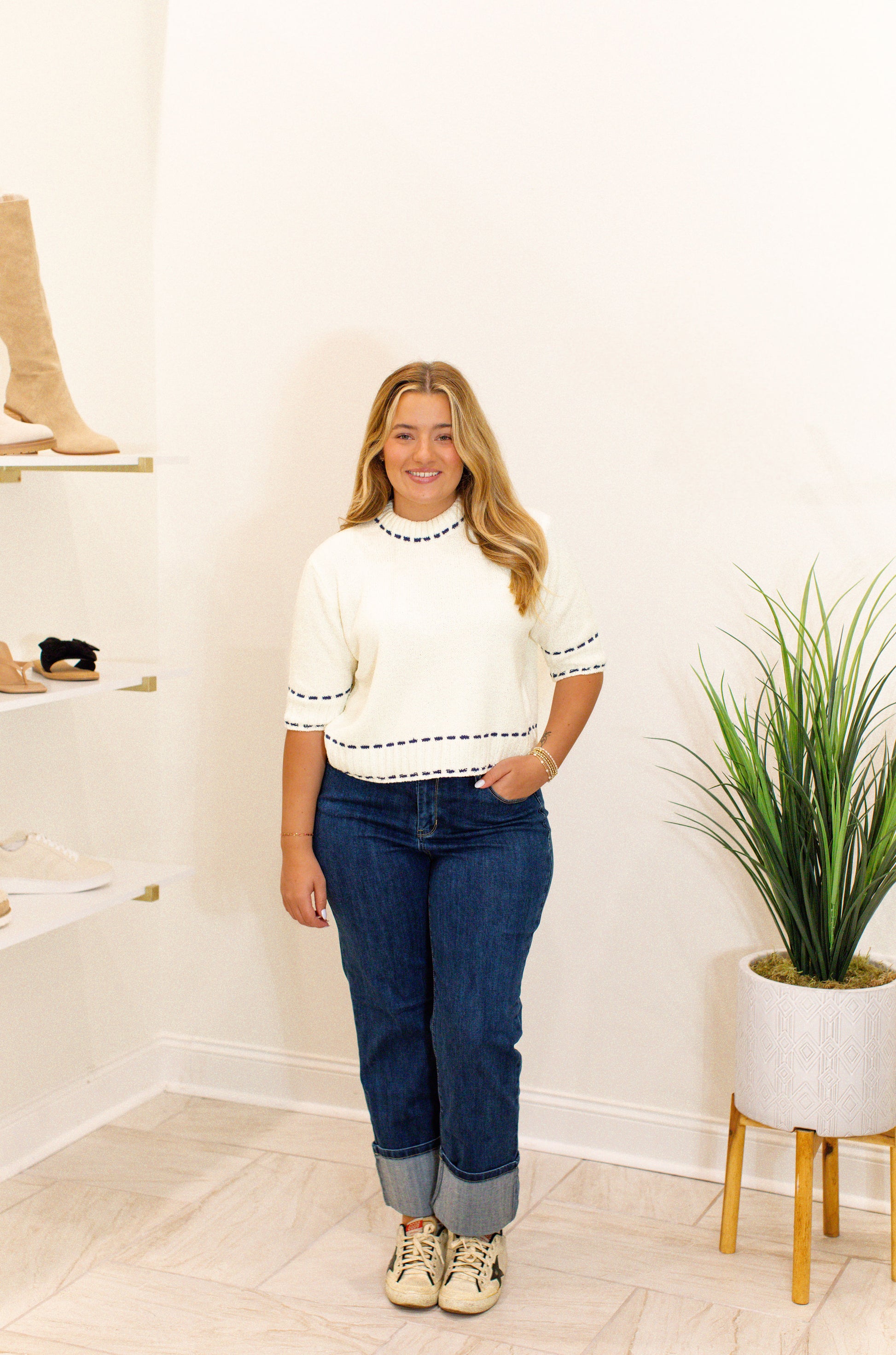 This short sleeve top features elegant navy stitching crafted from a soft blend of 85% acrylic and 15% nylon, ensuring durability and comfortable wear. Designed to enhance your everyday style, its lightweight fabric offers breathability while maintaining shape and color. Perfect for layering or wearing on its own, this top combines subtle detailing with lasting comfort for a polished, effortless look.