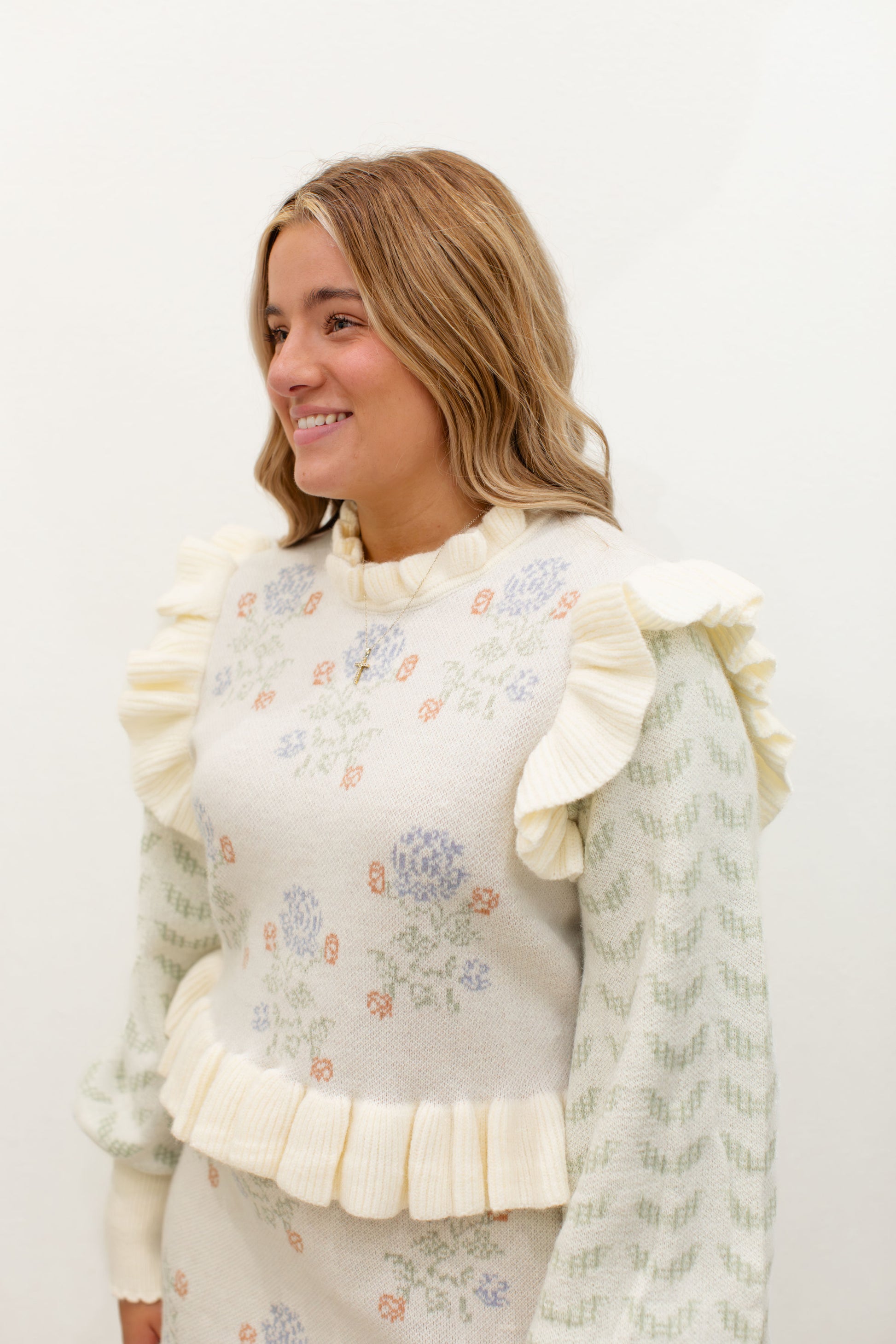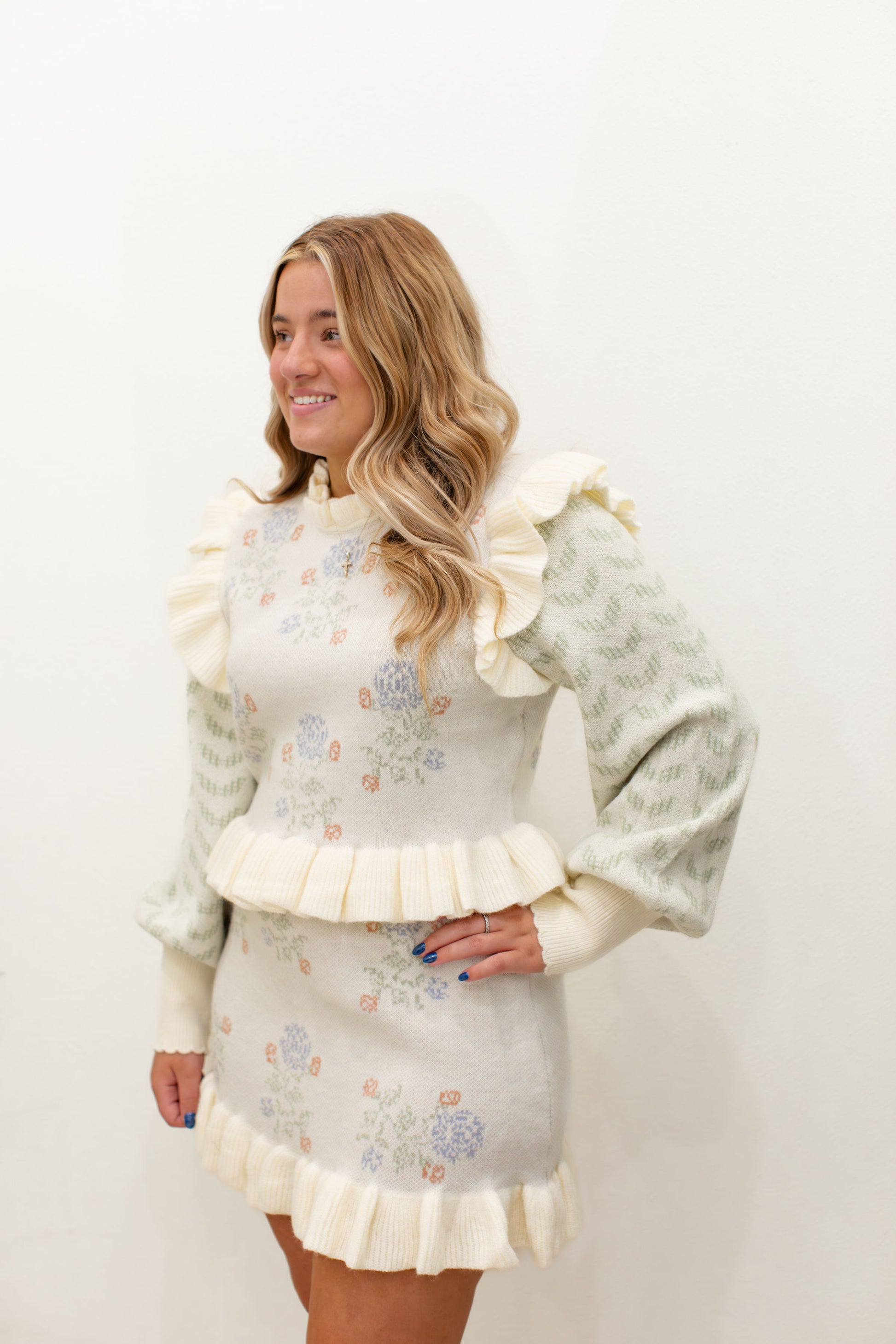 This knit top and mini skirt set features delicate floral ruffles, crafted from a blend of 45% acrylic, 29% polyester, and 26% nylon. With a soft and lightweight feel, this set is both stylish and comfortable, perfect for adding a touch of floral elegance to your wardrobe.