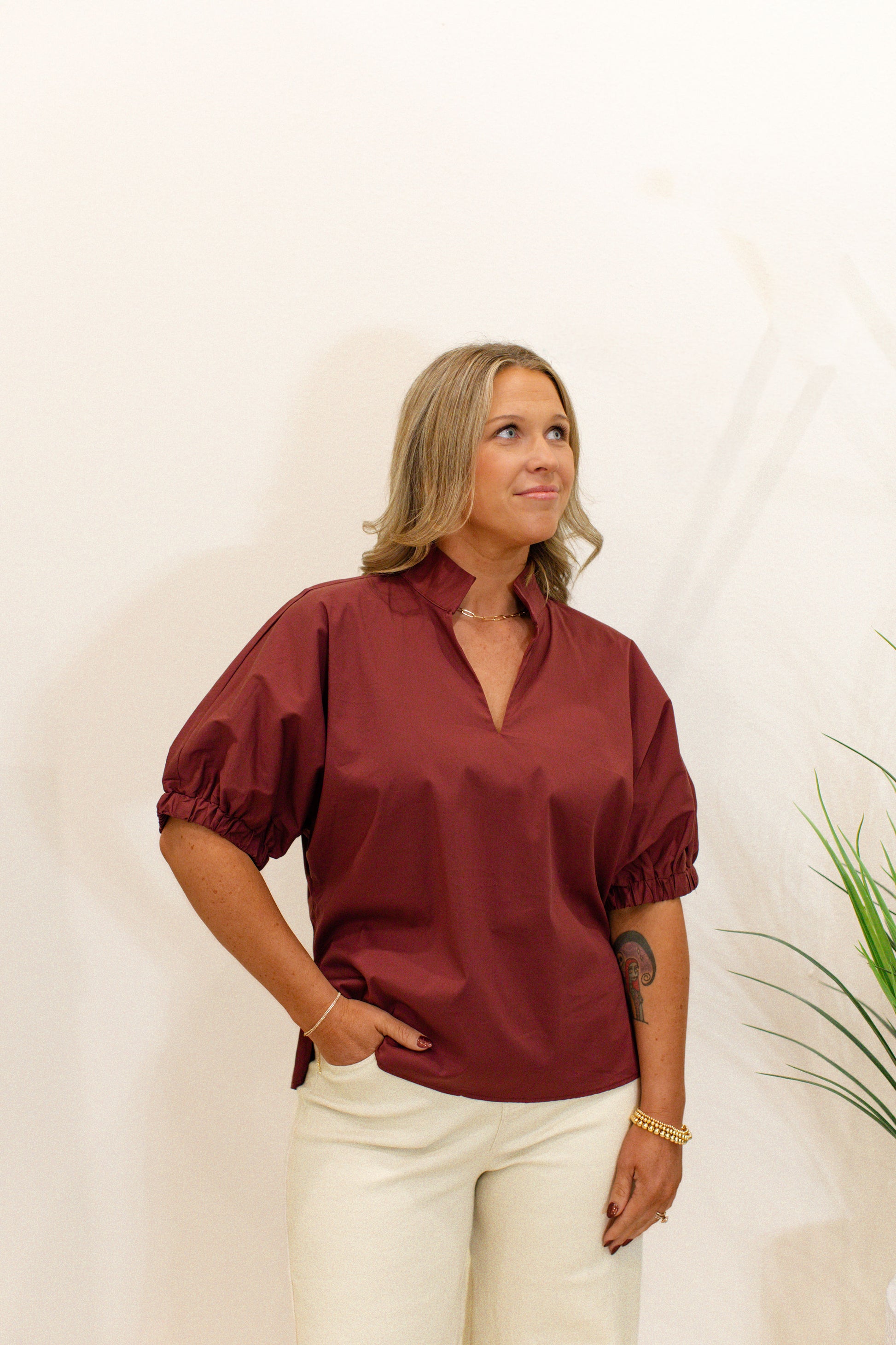 Elevate your wardrobe with the Wine Puff Sleeve Top, featuring a flattering V-neck and a chic standing collar. Crafted from a breathable blend of 70% cotton, 27% nylon, and 3% spandex, this unlined, sheer, lightweight woven fabric offers both comfort and style. The voluminous puff sleeves add a touch of drama, making it perfect for day-to-night looks. Embrace effortless elegance while staying cool and confident all day long.